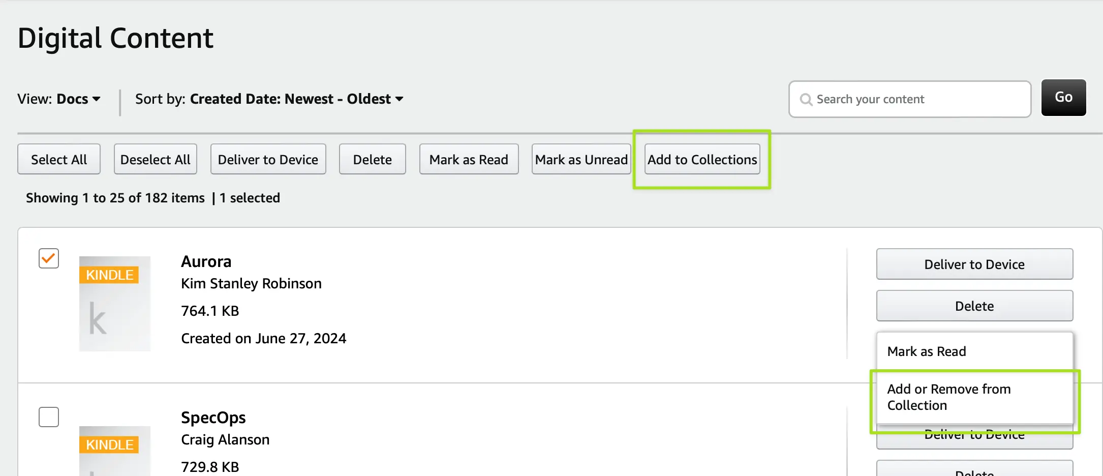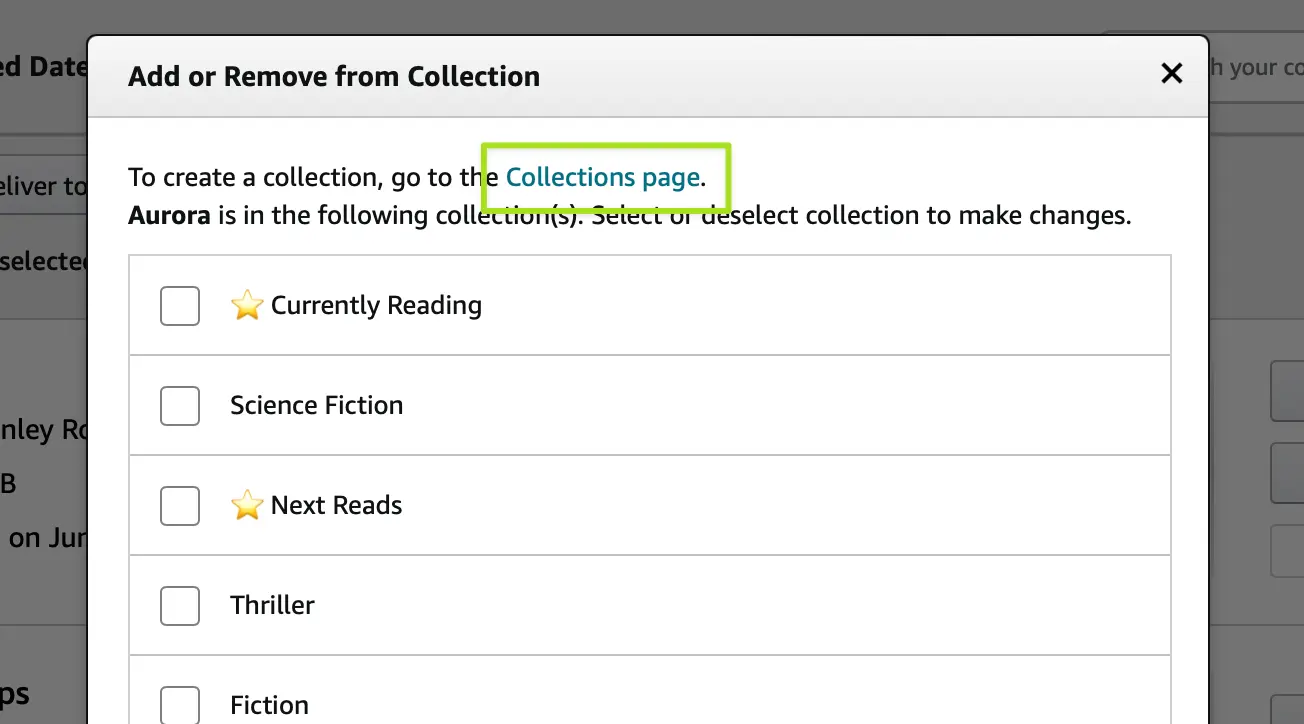 If you want to add, change, or remove, you have to look inside the vague "More Actions" button on each book row. The option here is similar-but-not-the-same function. Notably, if you choose this option you get the exact same dialog box as the previously discussed option, but this time you will see collections the book is already in. You can make adjustments (either adding or removing to any number of collections) but once again, this is visually identical to the "add only" function accessed by using the top bar.